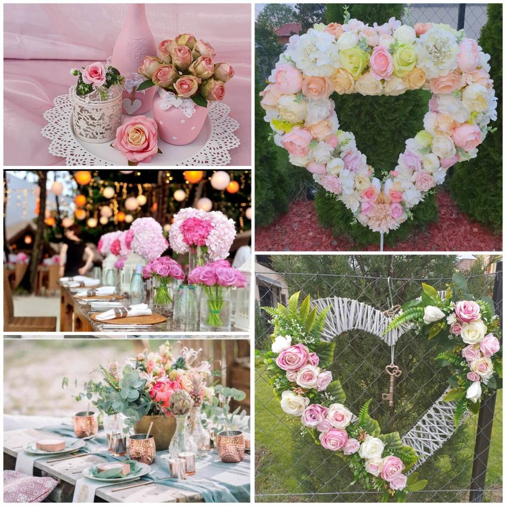 A romantikus esküvő tele van virággal, mindenhol és mindenben virág van: az asztalokon, a főasztalon, a szalvétákon, a tortán és még a fotókereten is. Egy romantikus esküvő lehet púderrózsaszín, levendula, halvány barackvirág színű, de lehet két színt kombinálni is, például a halványszürkét a púderrózsaszínnel vagy rózsaszínt babakékkel és persze csipke minden mennyiségben.